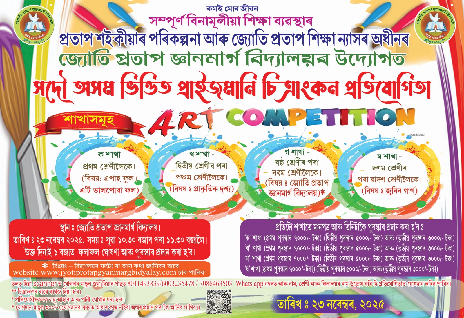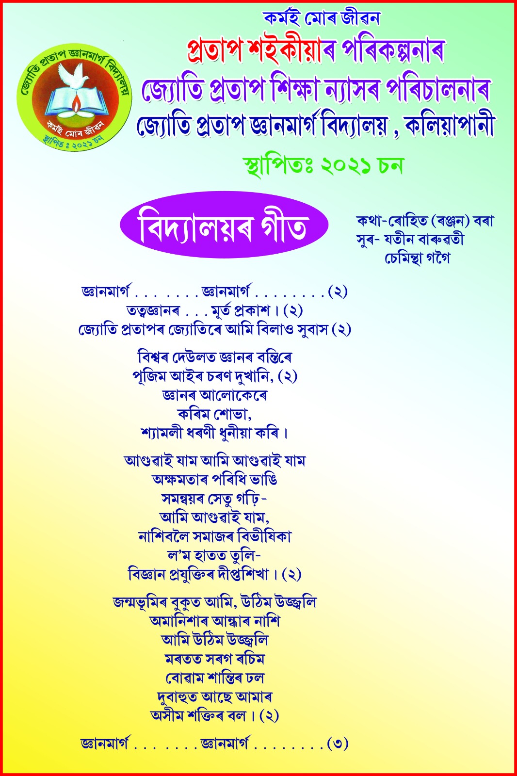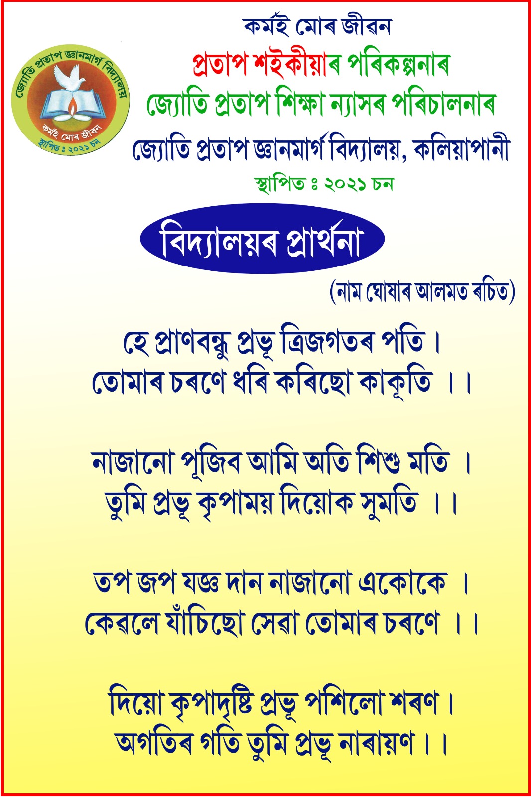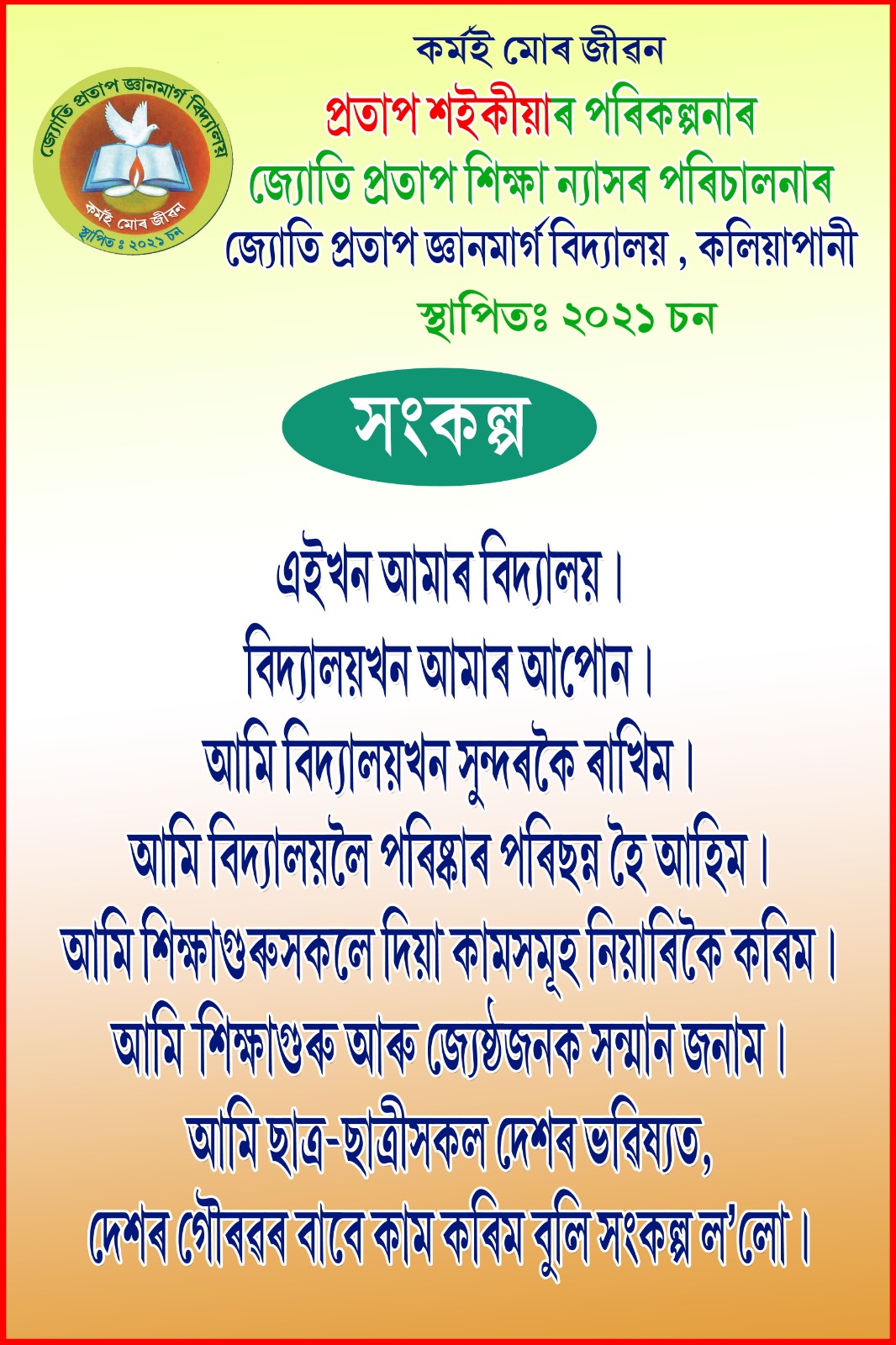 Because of his economic condition Mr Saikia was unable to complete his higher studies. He took a decision to form a Trust named “Jyoti Protap Education Trust”. Through this trust he started a completely Free School named Jyoti Protap Gyanmarg Bidyalay at Kaliapani. No admission Fees, No monthly Fees and no other fees. Protap Saikia provide Uniforms, Books and Copies, Pen, Pencils, notebook, School Bags, Shoes, Shocks and all the required things for to the Students. He also paid the Salary of the Staff, Electricity Bill and all other expenses of the School. In this School the students are teaches Yoga, Music, Satriya Dance and Dhul & Khul etc also freely. For those also all the expences paid by Protap Saikia.